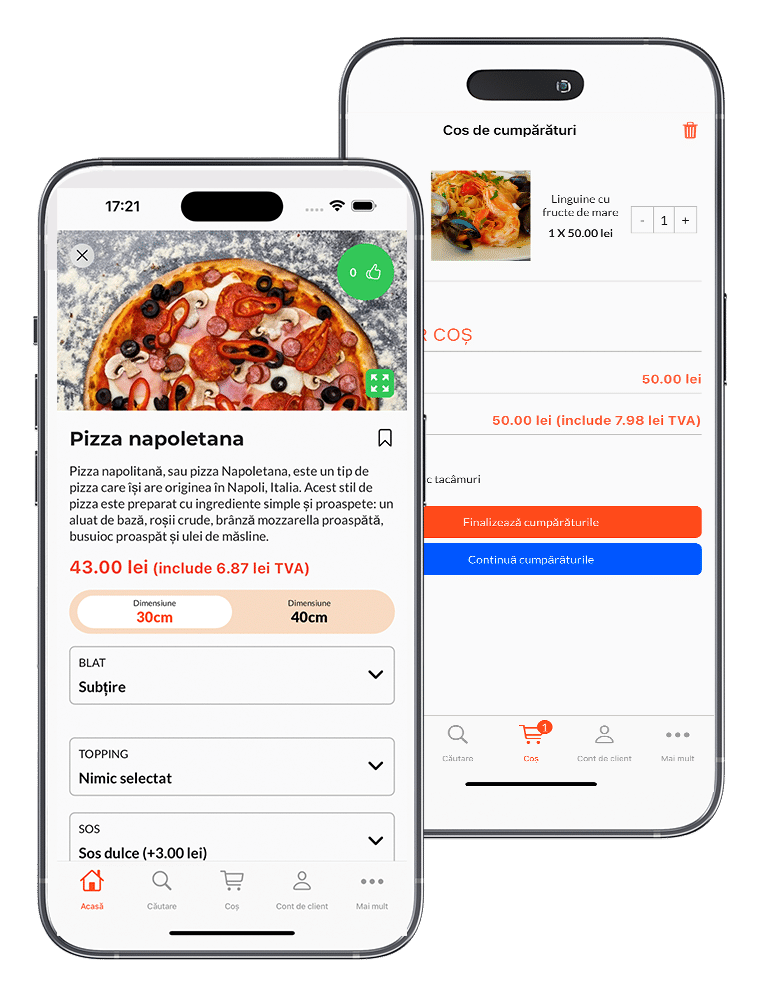 - Aplicații mobile personalizate cu brandingul tău pentru Android și iPhone, cu ajutorul cărora clienții vor vizualiza produsele restaurantului și vor plasa comenzi online.